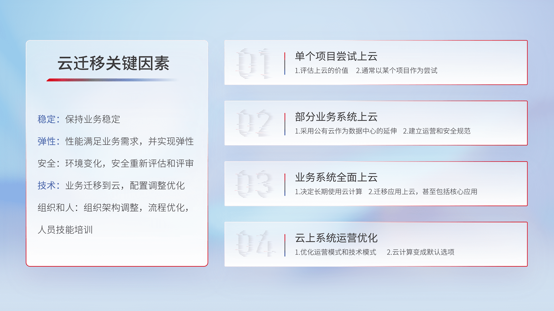 结合实际业务,,,,从规划设计、、、云平台选型、、、、云原生改造、、数据迁移、、、、集成交付,,,,迁移全过程为客户识别最佳上云路径,,做好风险识别管理,,,,设计网络架构、、、、身份权限、、、安全审计合规、、、操作审计、、、日志审计、、监控告警策略、、多站点容灾设计等,,,,对云上基础设施进行整体规划,,,,提升IT治理水平,,,以满足弹性、、、、高可用、、、高性能的需求。。