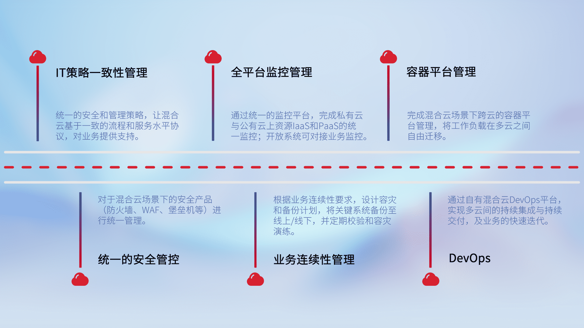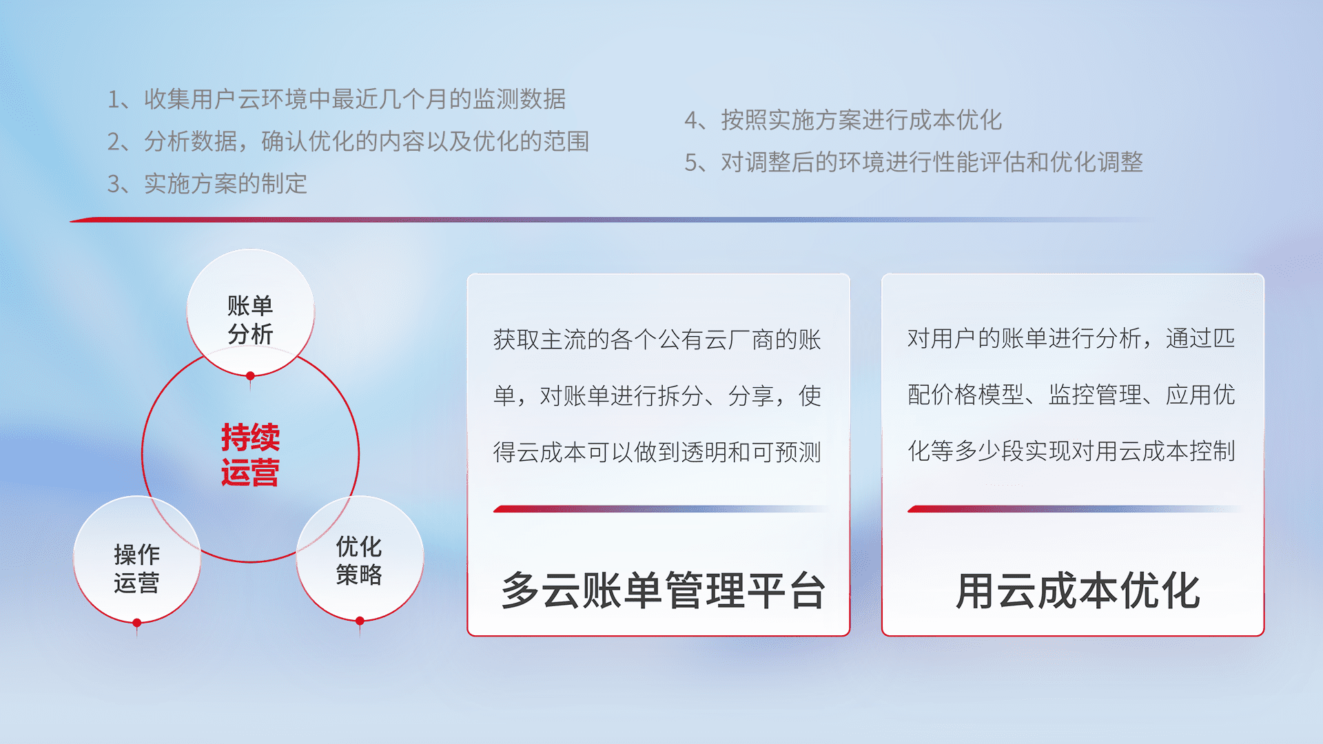 通过多云纳管,,以统一的资源数据模型把客户的云资源进行抽象和封装,,,,进而实现对多云资源的统一操作,,,,保障云资源管理的可靠性、、、、稳定性与可用性。。量身定制化运维内容,,配置、、开发运维、、补丁管理、、、、备份、、、、监控、、、认证和访问管理、、、、审计和日常巡检等,,保障在用云过程中的可靠度,,稳定度以及高可用率。。。